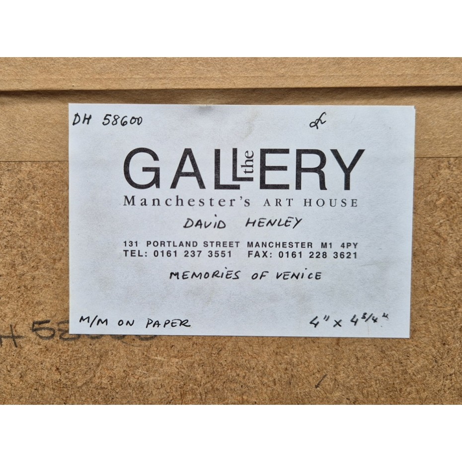 Artist: David HenleyTitle: ‘Memories of Venice'Description: An original painting in mixed media on paper. The work is in good condition and is housed in a good quality frame. Signed and dated lower right, original gallery label verso. Size: About 5.0 x 4.0 inches image s...