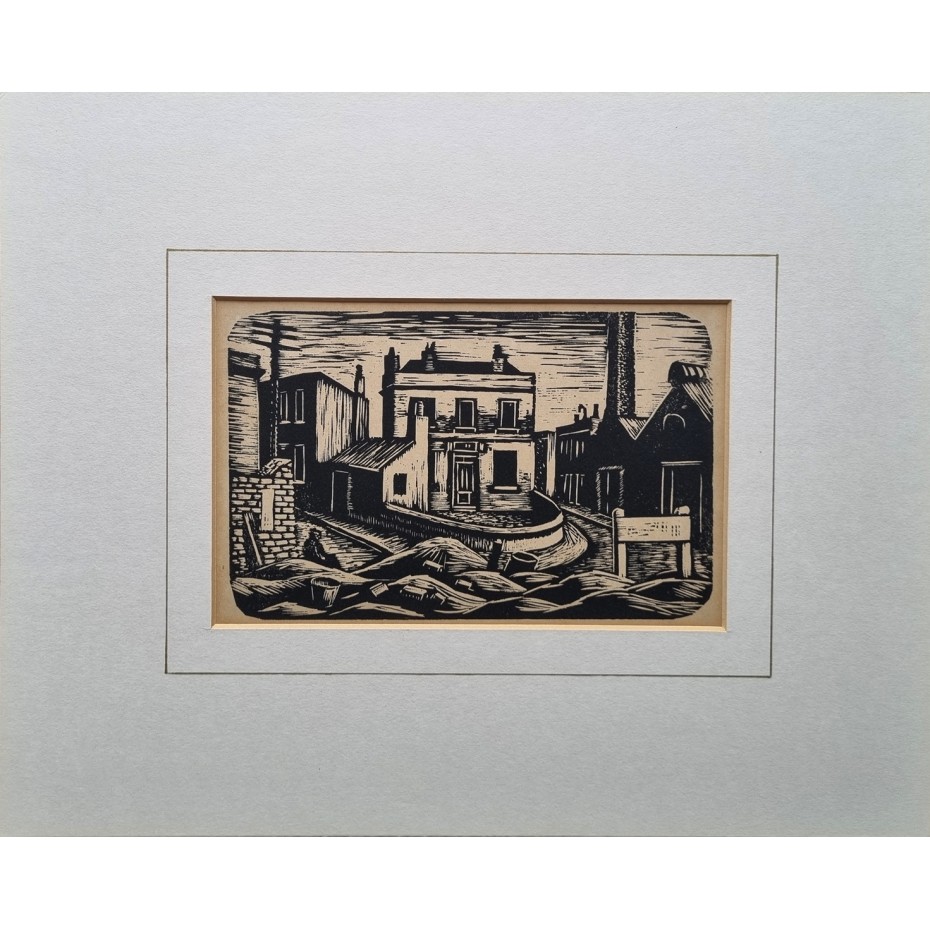 Description: An original linocut. A probable East London street scene, circa early-mid1930s. The work is in good original condition, there is some historic acid staining outside of the image which is mostly covered by its mount.
