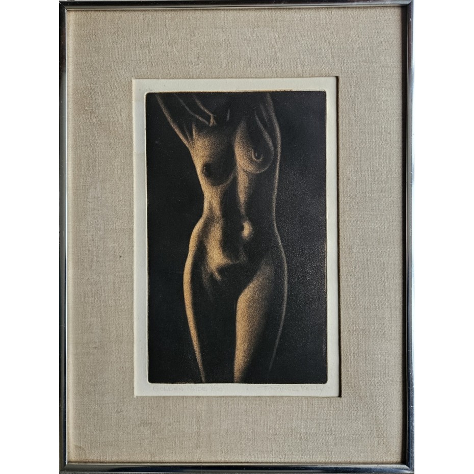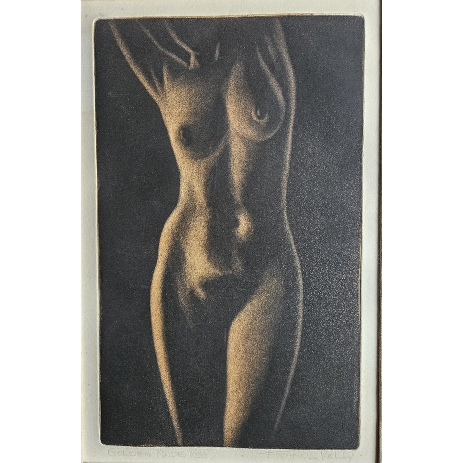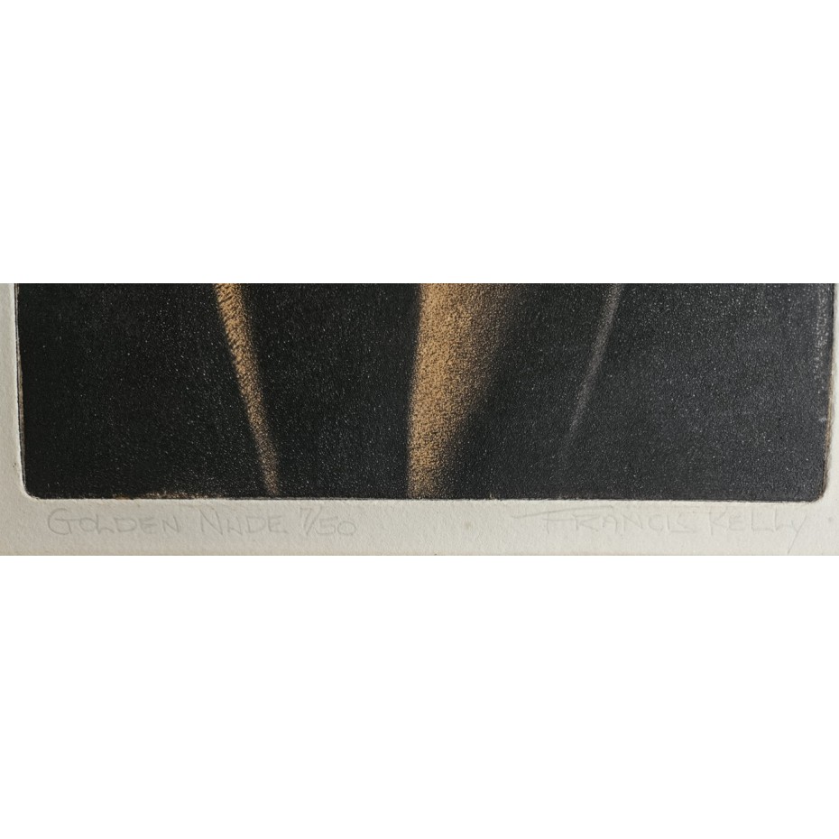 Artist: Francis KellyTitle: 'Golden Nude'Description: An original etching. The work is numbered 7 in pencil from an edition of 50 lower left, signed and titled. It is in good order save for some very minor foxing marks in the margins. Housed in simple metal frame with hessian mount. Size:&...