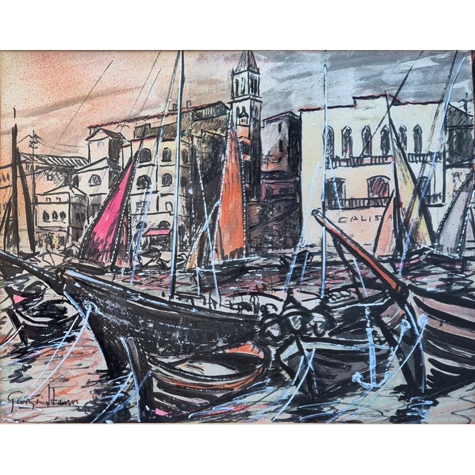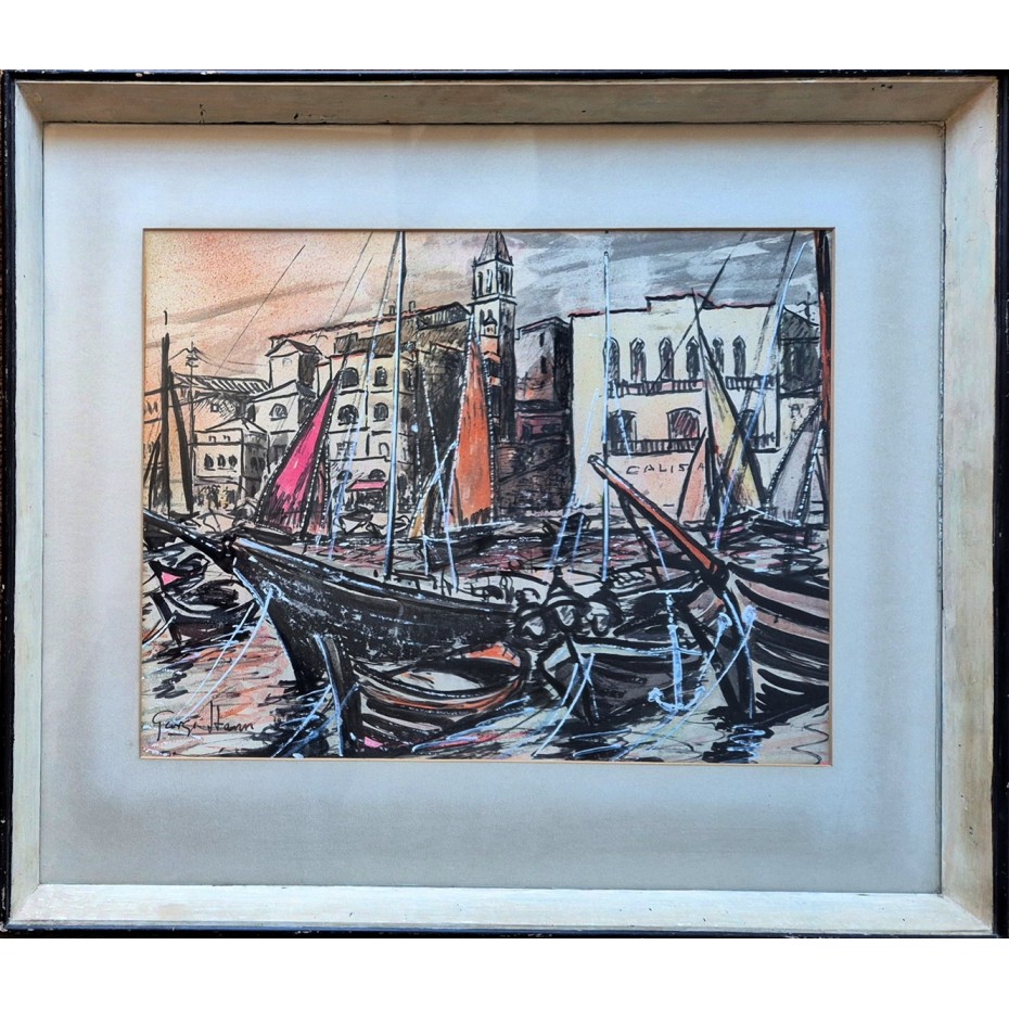 Description: A mixed media painting on paper in watercolour, gouache and inks, signed by the artist in full at lower left. Although undated we think this work is likely to be from the 1950s. It isn't titled recto or verso as far as we can tell and we think the subject is likely to be a view in a Mediteranean or Adriatic harbour, probably the South of France or Italy. It is housed in what we believe to be the original hand finished glazed frame in black and cream. Although the frame is of good quality, it is probably from the 1950s and has clear signs of wear and tear. However, it suits the painting well. We can ship the work unframed with a £35 discount - please ask and we will update the listing.