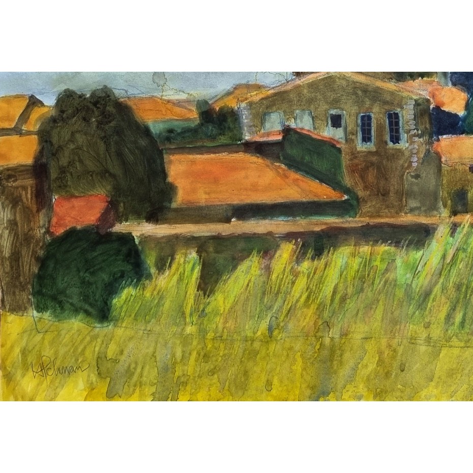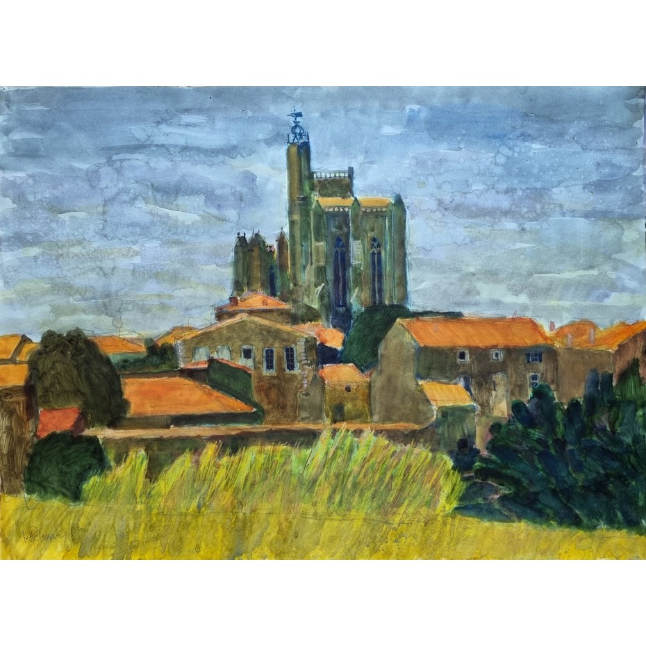 Description: An original watercolour and gouache painting on paper of a view towards a French cathedral. The work is in good condition and is signed lower left.