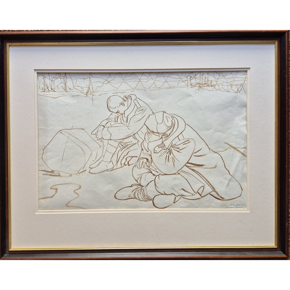 Artist: Hubert Arthur FinneyTitle: 'Prisoners of War'Description: An original drawing in sepia on paper. It is signed H A Finney and titled lower right. Circa early 1940s. The work is in good condition for its age save for some creasing to the paper. It is housed in a more modern frame of reaso...