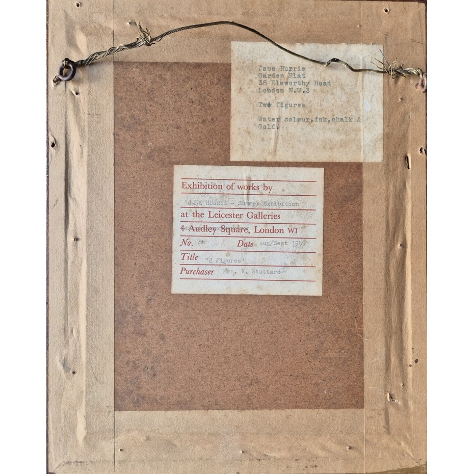 Artist: Jane HurrieTitle: '2 Figures'Description: An original work in mixed media (watercolour, chalk, ink and gold). Exhibited in 1969 at the Leicester Galleries, London with their label verso. The work is in good condition and is ready to hang.Size: About 5.6 x 4.0 inches image size...