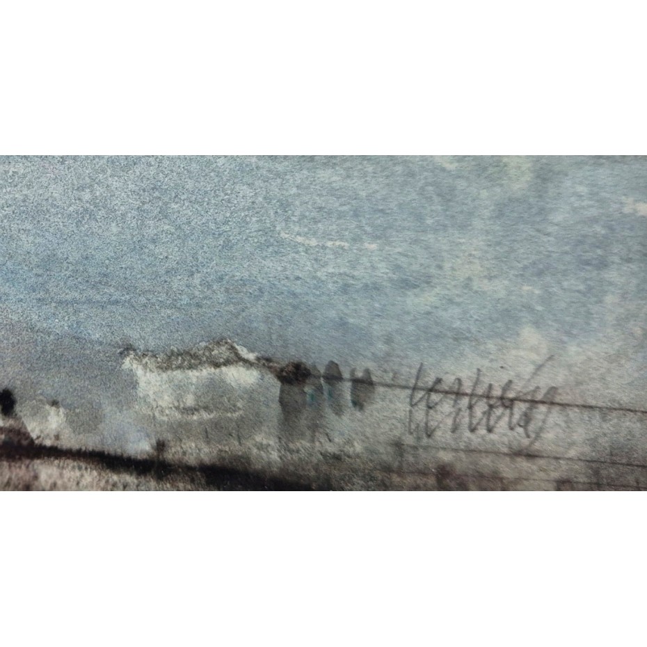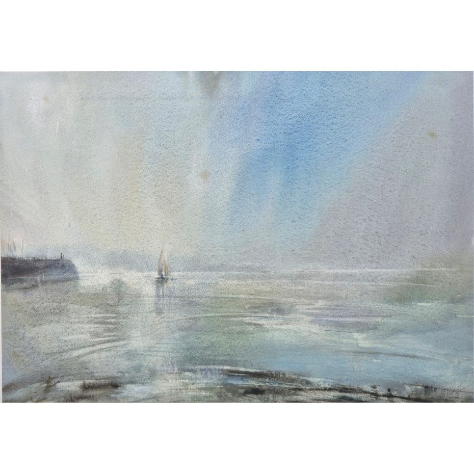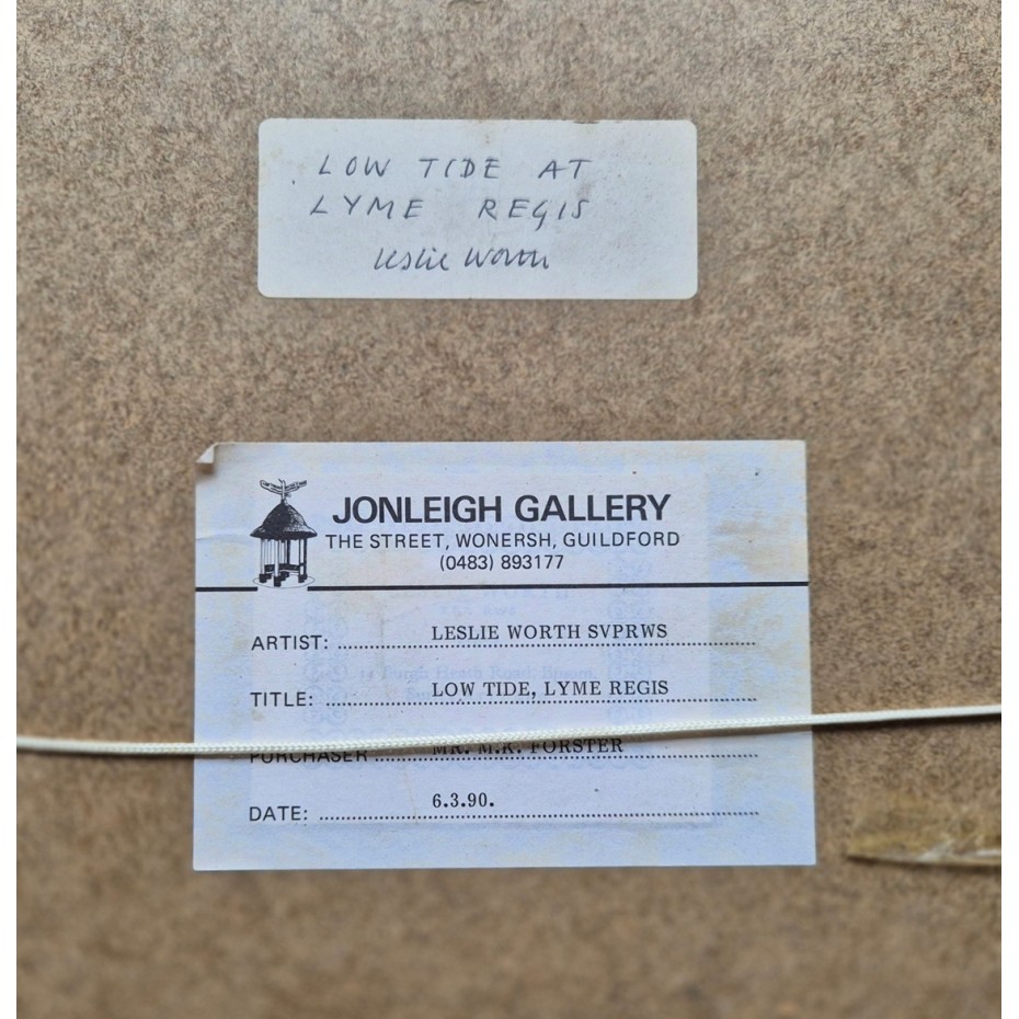 Description: An original watercolour on paper laid to a paper based backboard for exhibition at the Jonleigh Gallery of Wonersh, near Guildford in Surrey. It was sold in March 1990 and has the gallery label verso which records the title of the work. There is also a smaller label verso handwritten by the artist and signed by him. The watercolour itself is signed by the artist 'Leslie Worth' at lower right and was priced originally at £900. The artist supplied us with details of his works some twenty years ago when we visited him at his home in Epsom and on checking Leslie Worth was working in Lyme Regis in 1986. The work is in good original condition and it is housed in a hand painted grey coloured frame which appears to be the one fitted in originally.