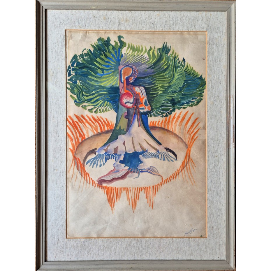 Description: An original work in mixed media (watercolour and gouache). The painting is signed lower left, with a hand written letter verso which appears to be by artist's hand. The frame has some wear but is serviceable, the painting has some creasing and time staining but is presentable.
