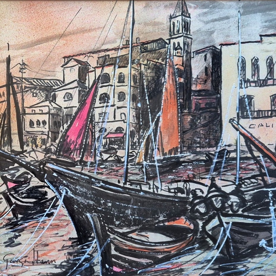 Artist: George HannTitle: 'Harbour Scene'Description: A mixed media painting on paper in watercolour, gouache and inks, signed by the artist in full at lower left. Although undated we t...