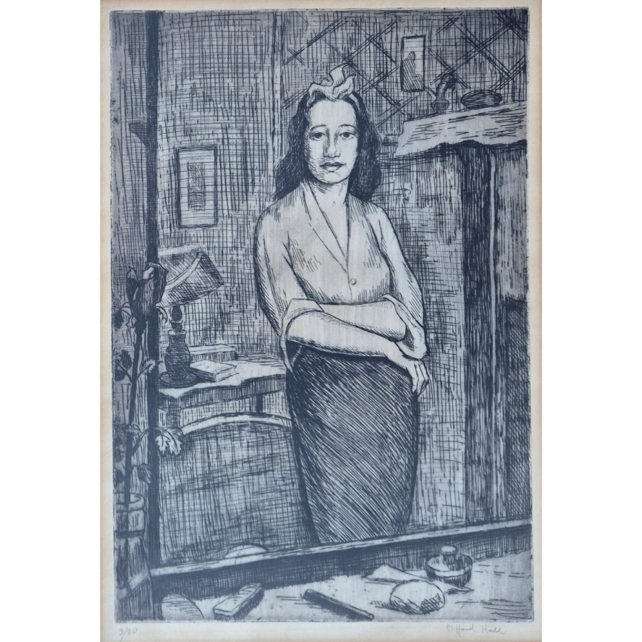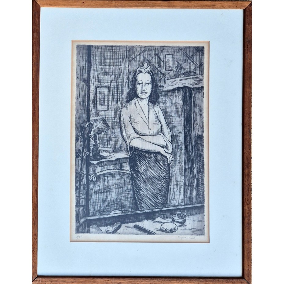 Description: An original etching of a woman (Emie) in a mirror, which although undated is from the 1960s. The etching is based on drawings and paintings by the artist from the early 1940s (source - with acknowledgement to the artist's son Geraint Hall). Emie appeared in other works too by the artist. It is pencil signed by the artist at lower right and numbered 3 of an edition of 20 lower left. The etched image is in very good condition. There is some light toning to the paper in the margins. The wooden frame may well date to the 1960s. It has some wear and tear but is in reasonable order for its age. It appears that the mount was replaced more recently. An example of this work was sold at Bonhams in London in 1997 with the generic title 'Portrait of a Girl with Her Arms Folded'.