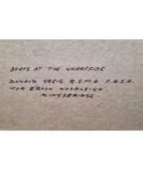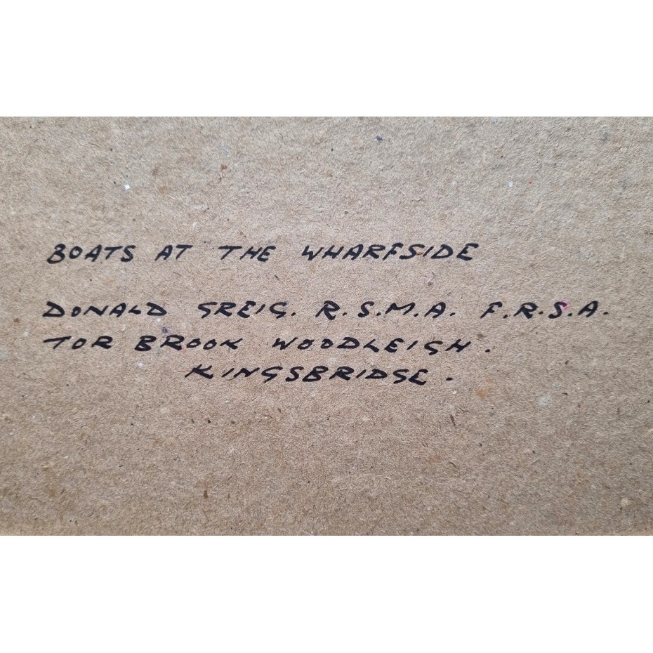 Artist: Donald Greig, RSMATitle: Boats at the WharfsideDescription: A framed original watercolour, in what appears to be the artist's original frame with a washline mount. The work is signed by the artist lower left and titled by him on the backboard as pictured. It is in good original conditio...