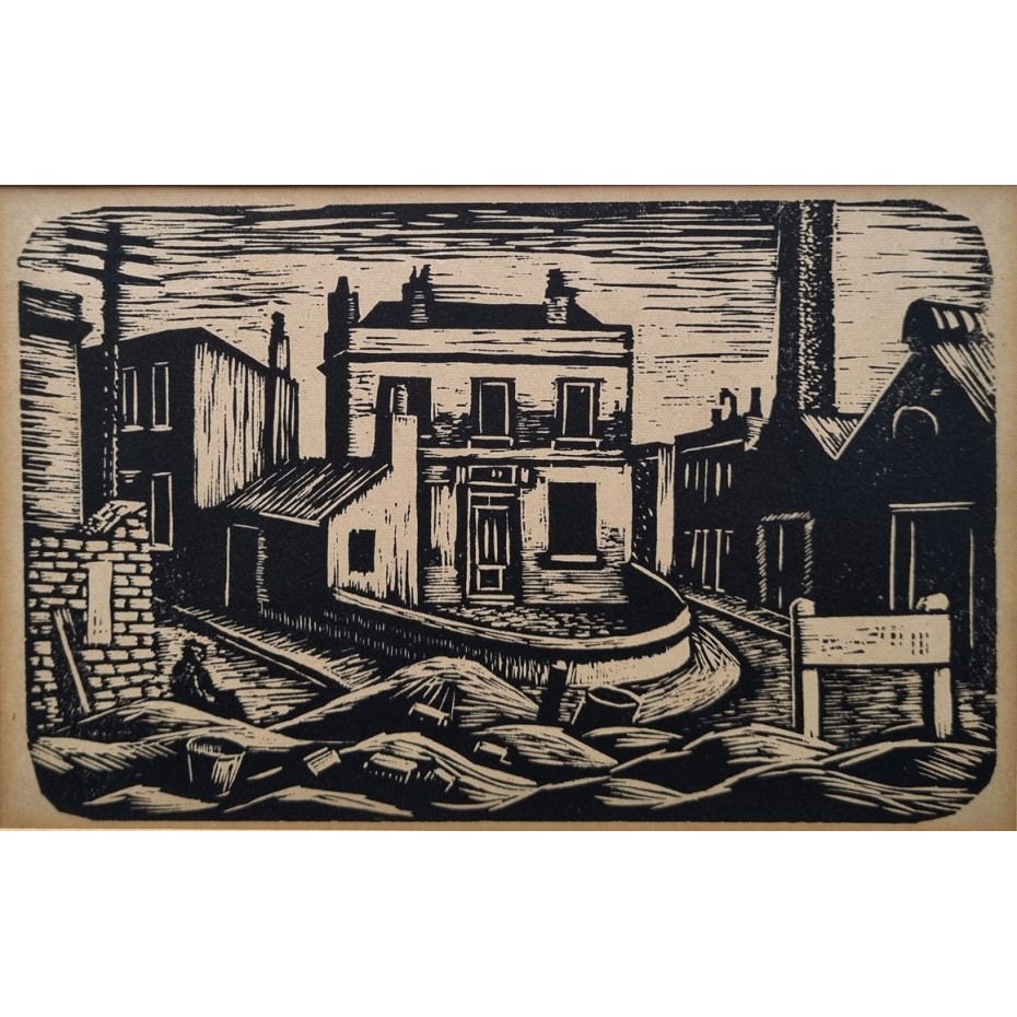 Description: An original linocut. A probable East London street scene, circa early-mid1930s. The work is in good original condition, there is some historic acid staining outside of the image which is mostly covered by its mount.
