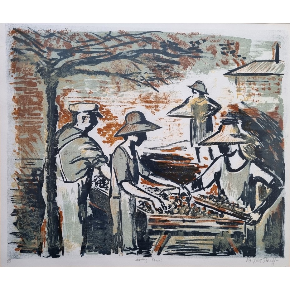 Artist: Margaret SheaffTitle: 'Sorting Plums'Description: An original screenprint, signed by the artist lower right, titled and editioned 1 of 3 prints only. The work is in excellent condition and is housed in a simple wooden frame ready for hanging.Size: About 17.7 x  21.7 inche...