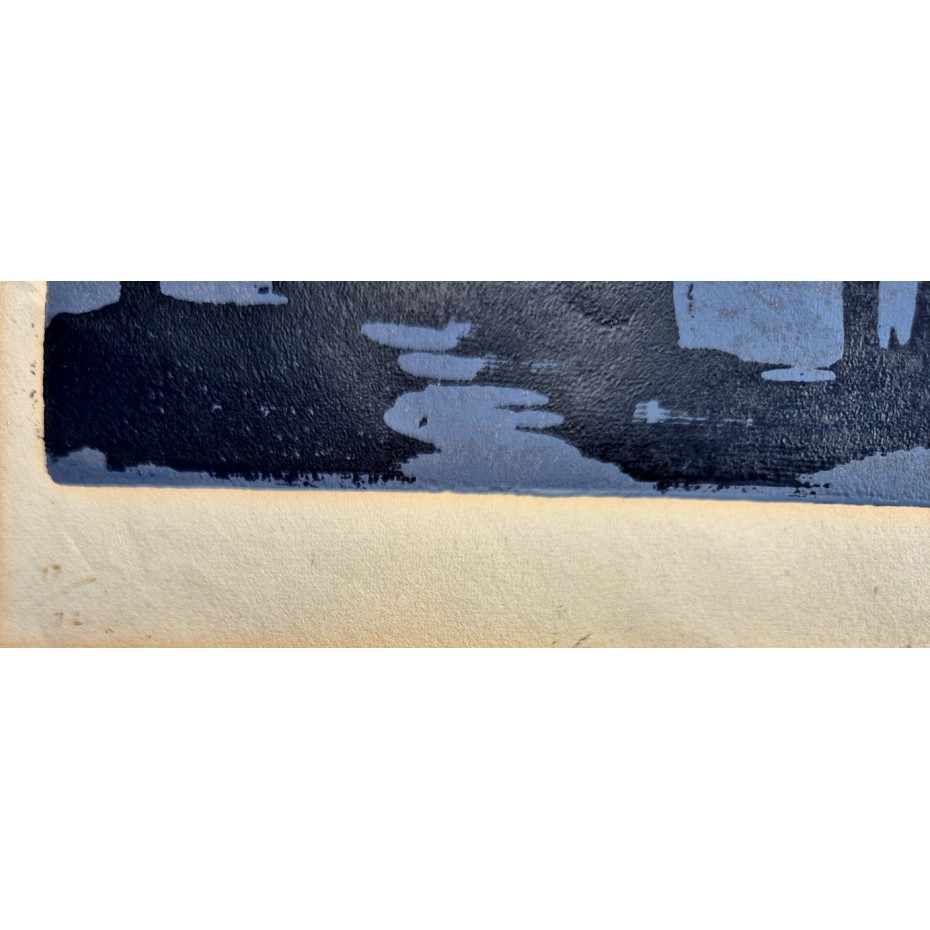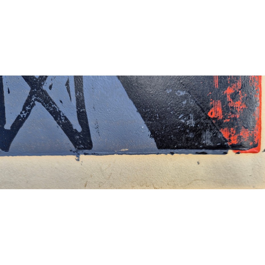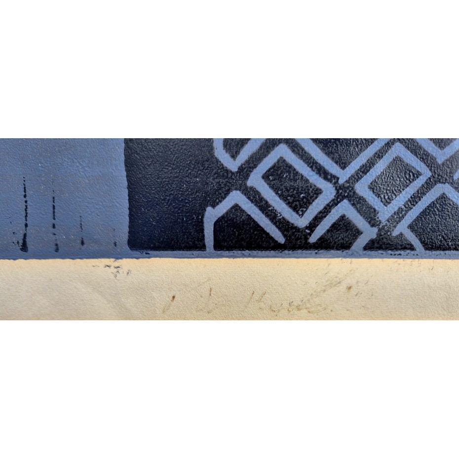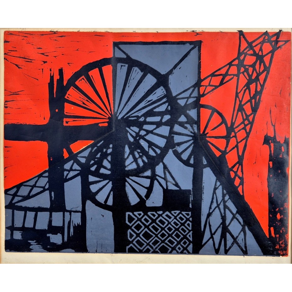 Description: An original linocut, unframed but housed in its original mount, of a coal mining subject, presumably from Nottinghamshire or the North of England. The work is signed by the artist to the reverse 'P. Dawson' and priced by her then at £5. We do not know the date of the work but our feeling is that it is from the late 1950s or the 1960s. The image itself has great colours (red, black, grey) and save for some very minor creases it is in good condition, with strong colour. The linocut is also signed in pencil below the image, numbered and titled but these inscriptions have faded considerably over time although are just about legible. The signature is lower right, the title 'Pit Head' is lower centre, and the edition number is lower left. However, the edition number isn't that clear. We think it is 11 from an edition of 12. The work would benefit from a new mount and then framing to suit the requirements of the buyer. The work will be shipped large flat in a strong carton.