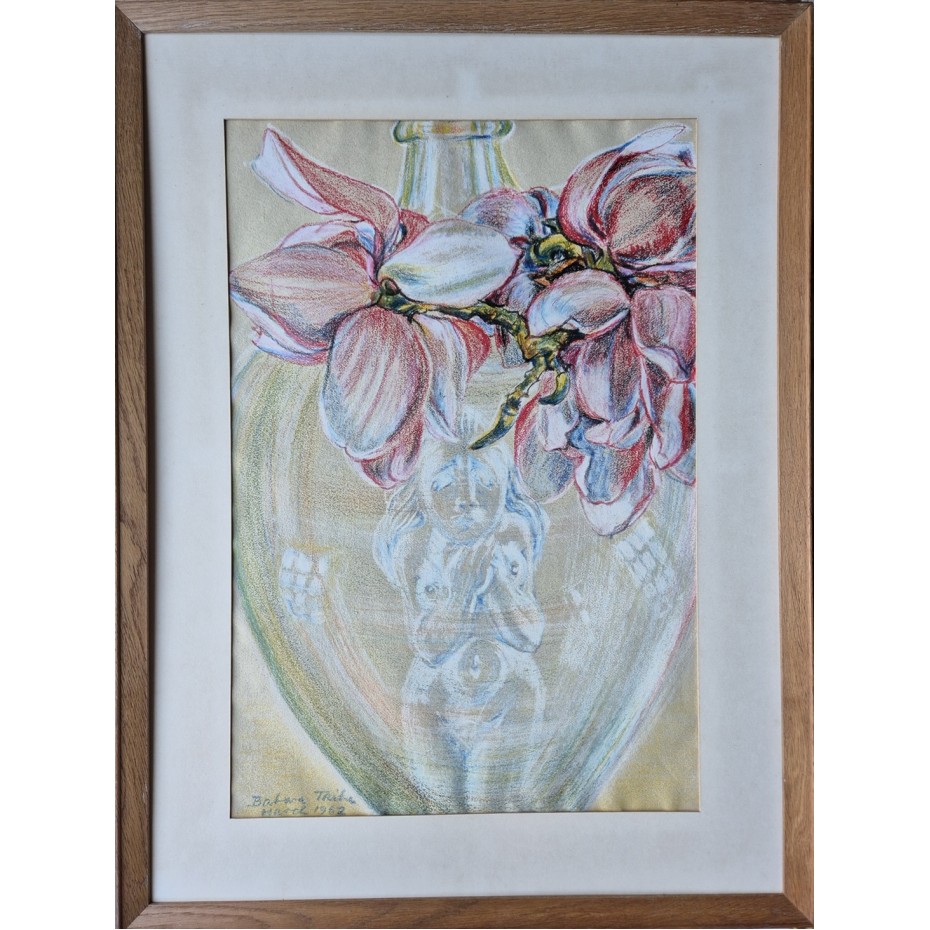 Artist: Barbara TribeTitle: 'Flowers in a Vase'Description: An original drawing in pastel. The work is signed lower left and dated there March 1962. It is in good original condition, the mount has some toning in places so would ideally be replaced. Housed in its original frame which is in good ...