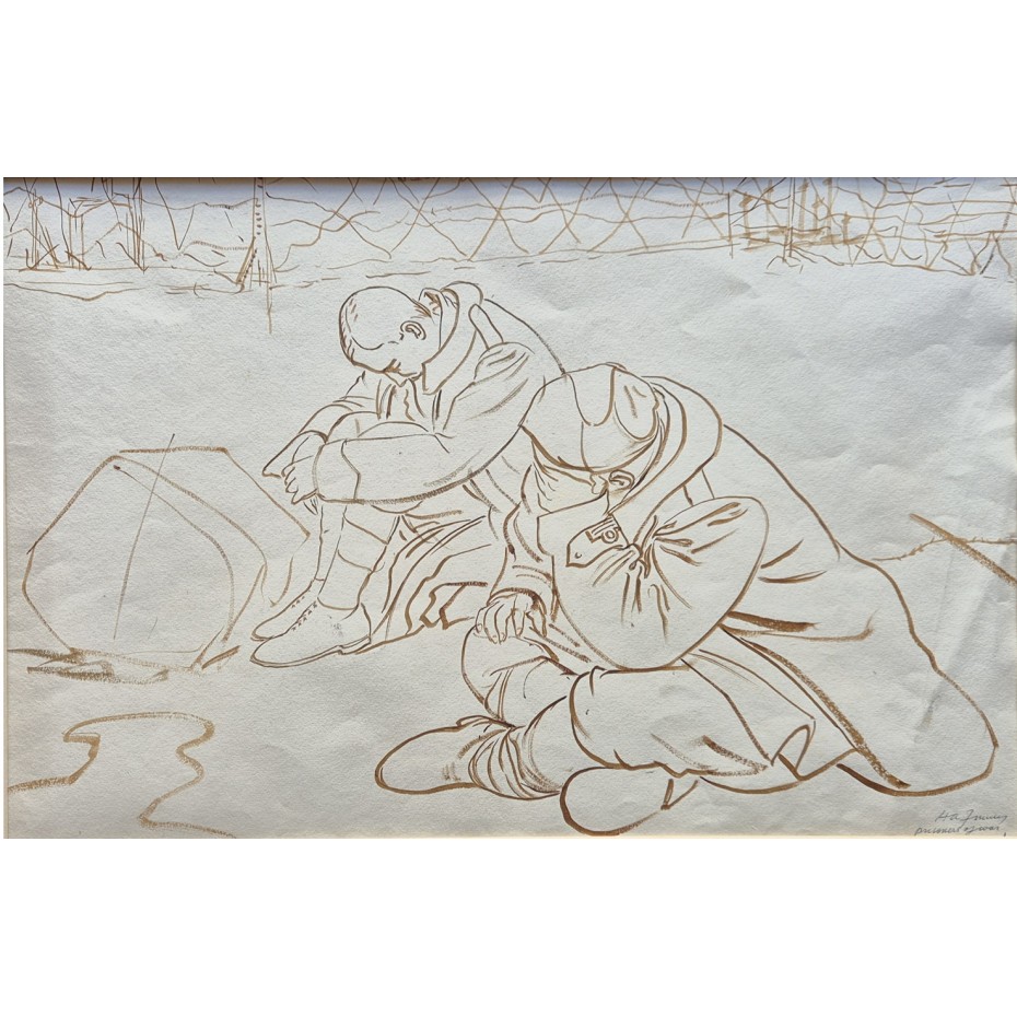 Artist: Hubert Arthur FinneyTitle: 'Prisoners of War'Description: An original drawing in sepia on paper. It is signed H A Finney and titled lower right. Circa early 1940s. The work is in good condition for its age save for some creasing to the paper. It is housed in a more modern frame of reaso...
