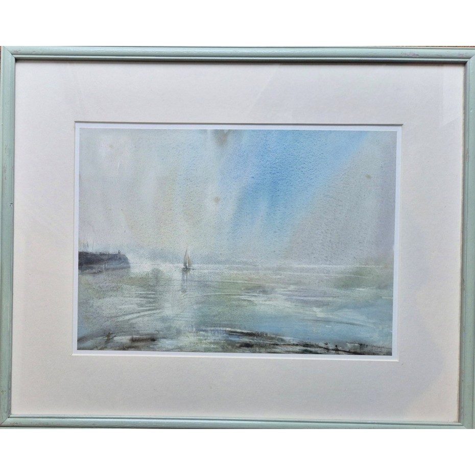 Description: An original watercolour on paper laid to a paper based backboard for exhibition at the Jonleigh Gallery of Wonersh, near Guildford in Surrey. It was sold in March 1990 and has the gallery label verso which records the title of the work. There is also a smaller label verso handwritten by the artist and signed by him. The watercolour itself is signed by the artist 'Leslie Worth' at lower right and was priced originally at £900. The artist supplied us with details of his works some twenty years ago when we visited him at his home in Epsom and on checking Leslie Worth was working in Lyme Regis in 1986. The work is in good original condition and it is housed in a hand painted grey coloured frame which appears to be the one fitted in originally.