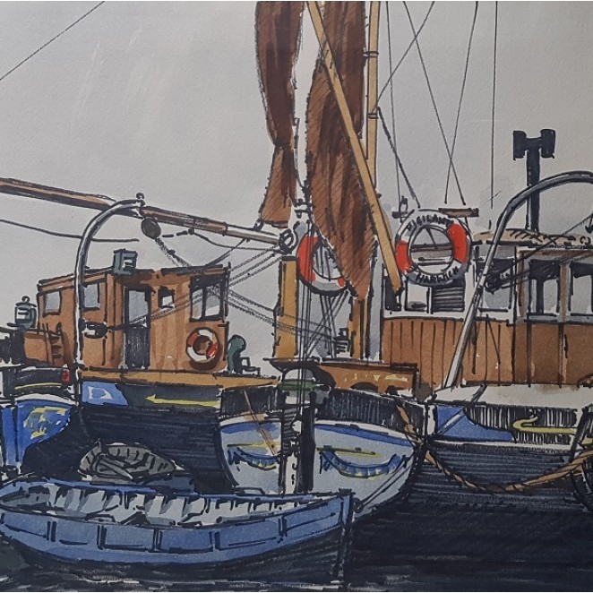 Artist: Hugh KnollysTitle: 'Boats at Harwich, Essex' - a signed original painting in mixed media; framed Description: The present painting is signed by the artist lower left and is likely to date to ...